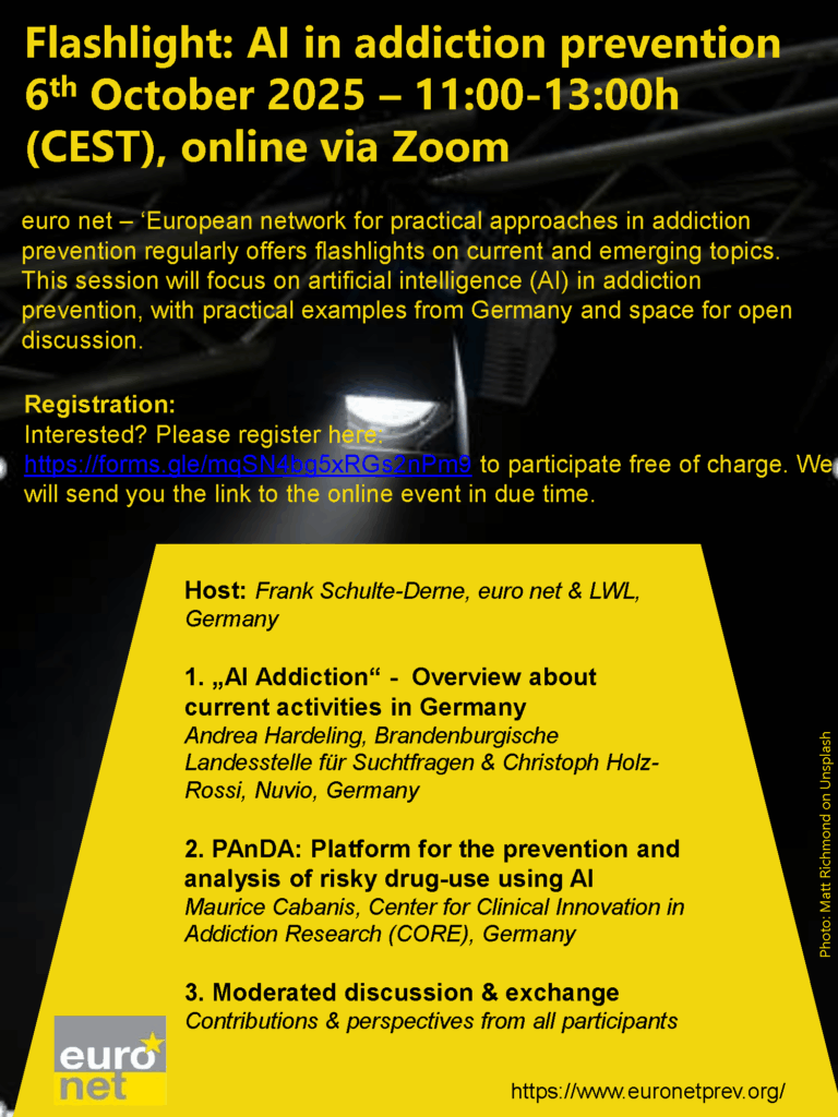 Euro net je európska sieť pre praktické prístupy v prevencii závislostí a pravidelne ponúka prehľady o aktuálnych a inovatívnych témach. Tento webinár sa zameriava na využitie umelej inteligencie (AI) v prevencii závislostí, s praktickými príkladmi z Nemecka. V rámci webináru bude aj priestor pre diskusiu.