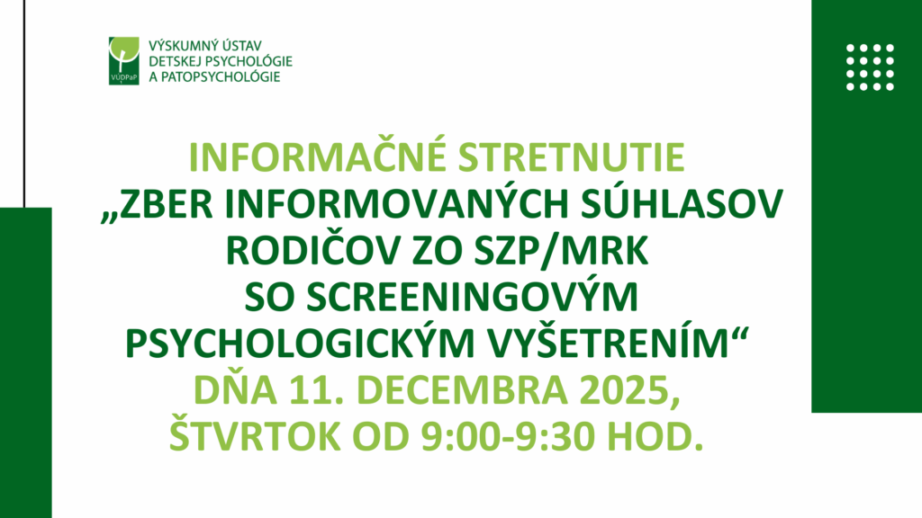 pozývame vás na pravidelné opakované: Informačné stretnutie „ Zber Informovaných súhlasov rodičov zo SZP/MRK so screeningovým psychologickým vyšetrením“ dňa 11.decembra 2025, štvrtok od 9:00 – 9:30 hod.