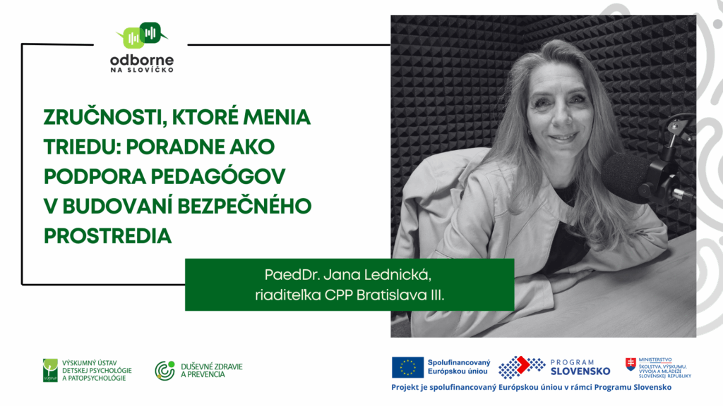 V novej epizóde sa rozprávame s PaedDr. Janou Lednickou, riaditeľkou CPP Bratislava III. a lektorkou inovačného vzdelávania Rozvoj zručností pre prácu so skupinou so zameraním na podporu duševného zdravia, ktoré realizuje Výskumný ústav detskej psychológie a patopsychológie v rámci národného projektu Systémová podpora duševného zdravia a prevencie detí, žiakov a študentov.