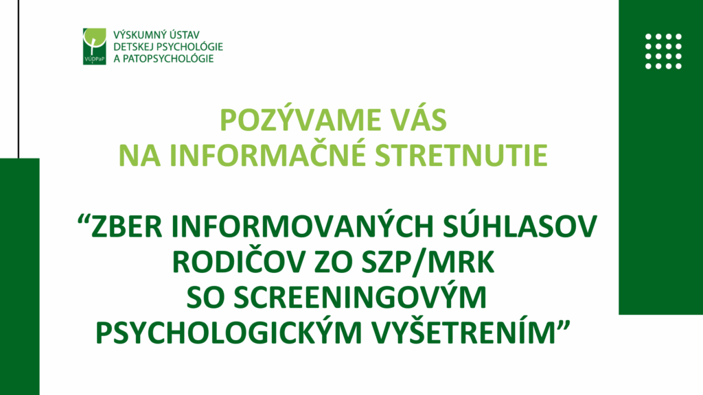 pozývame Vás na: Informačné stretnutie „ Zber Informovaných súhlasov rodičov zo SZP/MRK so screeningovým psychologickým vyšetrením“ dňa 30. októbra 2025, štvrtok od 9:30-10:00 hod.