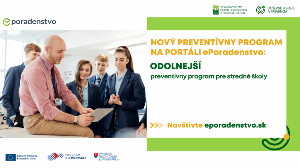 Program Odolnejší je bezplatne dostupný odborným zamestnancom zariadení CPP, ŠVZ, škôl a školských špeciálnych pedagógov na: eporadenstvo.sk. V internetovej aplikácii nájdete aj ďalšie preventívne a adaptačné programy.
