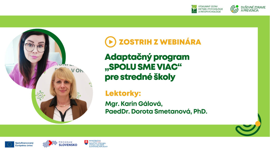 Prechod na strednú školu je významnou zmenou v živote žiakov. Webinár predstavil program „SPOLU SME VIAC“, ktorý podporuje adaptáciu prvákov na prostredie strednej školy. To, ako sa žiaci cítia v prostredí školy a ako sa zapájajú do školského života súvisí aj s ich pocitom bezpečia, prijatia a spolupatričnosti.