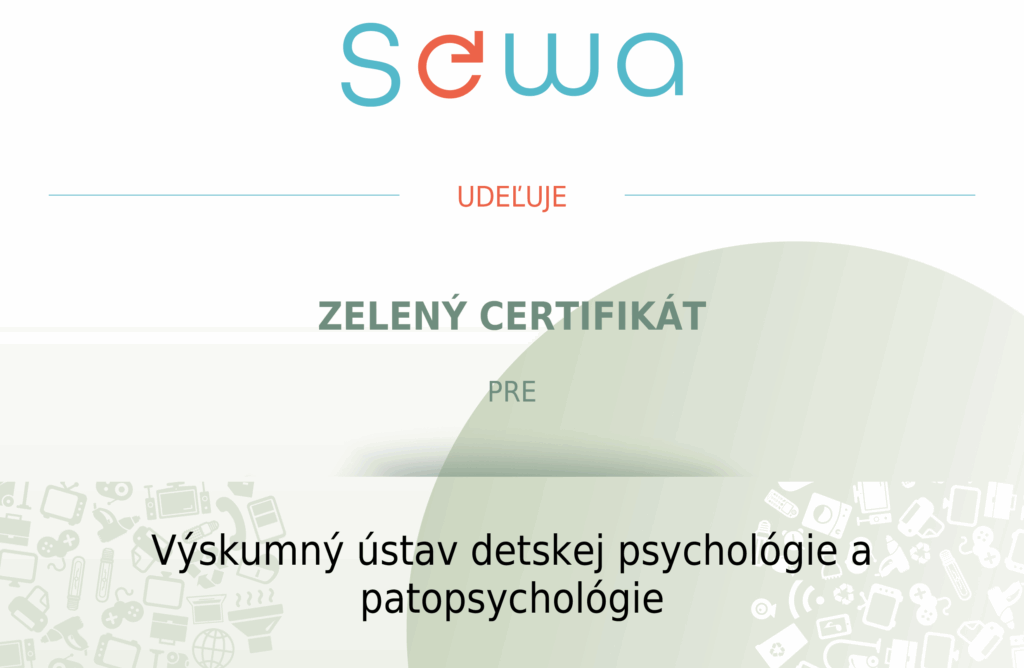 Výskumný ústav detskej psychológie a patopsychológie získal Zelený certifikát organizácie SEWA, a. s., za zabezpečenie ekologickej recyklácie a spracovania elektroodpadu a prenosných batérií.